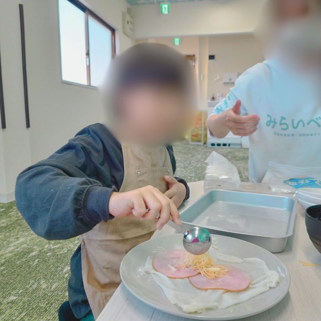 やさしく皮を広げて、ハムとチーズをのせてくるくる巻く作業では、皮が破れないように力加減に気をつけながら、丁寧に進める姿が印象的でした✨