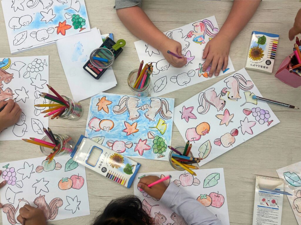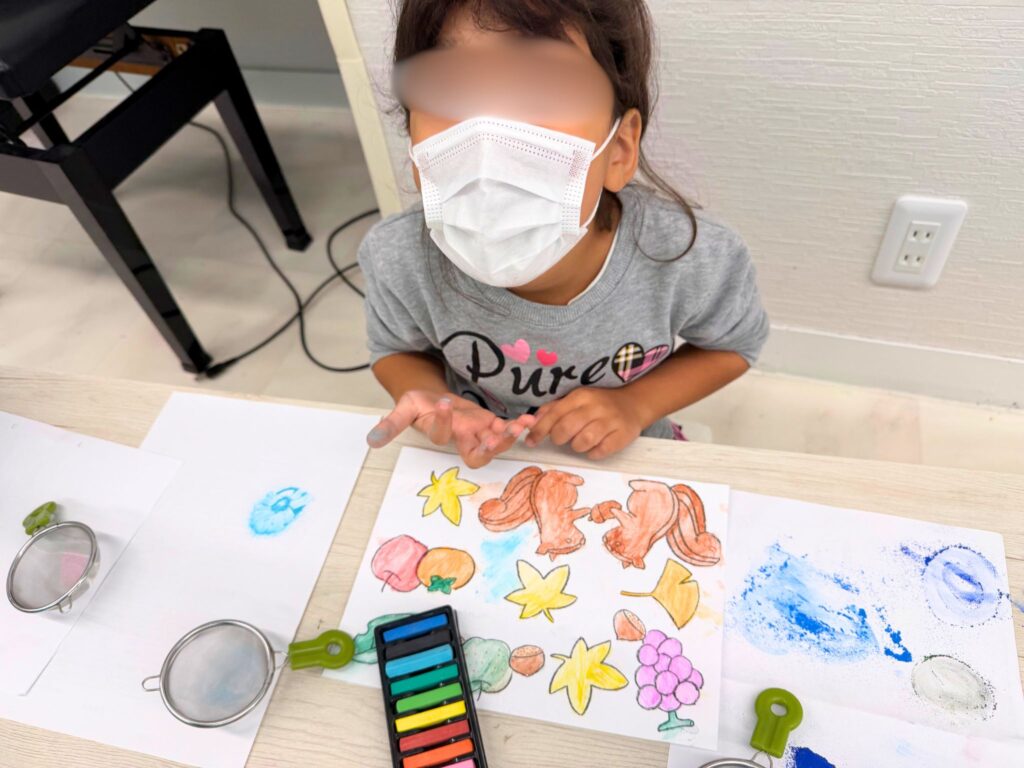 子どもたちは真剣な表情で見入り、そっと筆を動かしながら自分なりの“秋らしい色”を探していました。