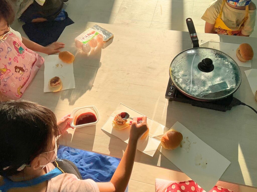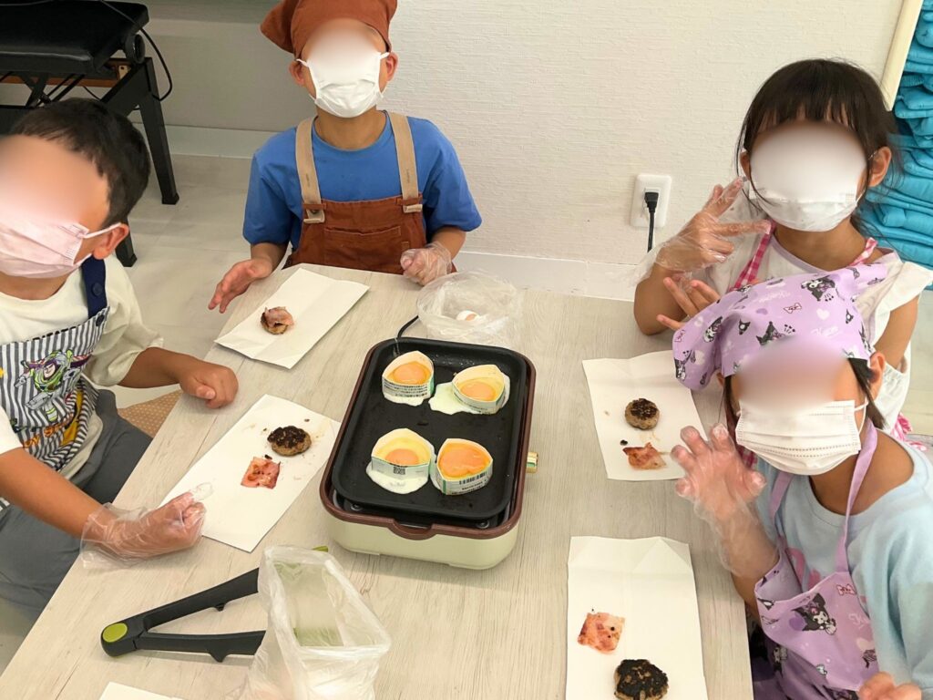 じゅうじゅうと音を立てながら焼ける香ばしい匂いに、子どもたちからは「いいにおい~!」「はやく食べたい!」と待ちきれない声があがります😊
