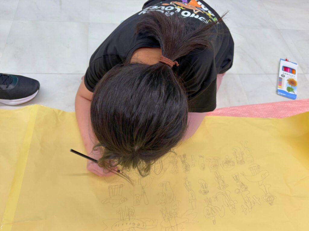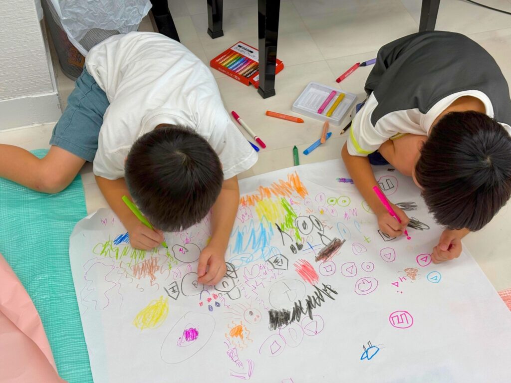 最初は一人ひとりが自分の好きなものを描いていましたが、次第に「ここに合わせよう!」「続きはこうしたらどうかな?」とコラボレーションが広がっていきました🌈