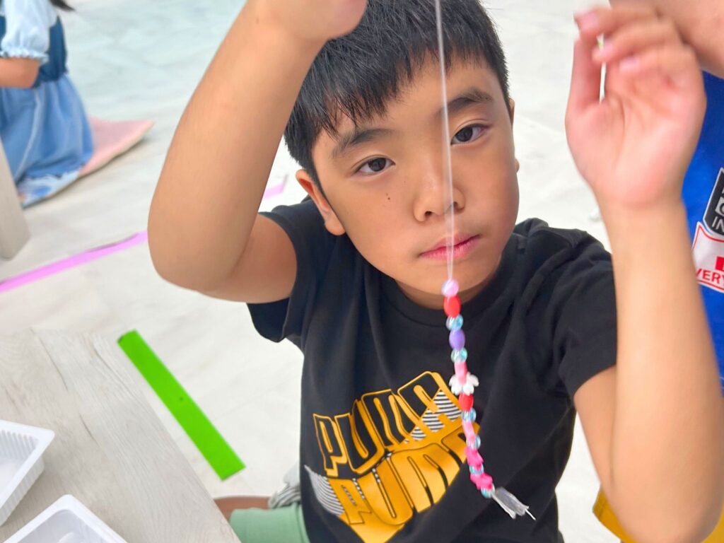小さなビーズを指先でつまんで通す作業は、集中力や手先の器用さも育まれる大切な時間。